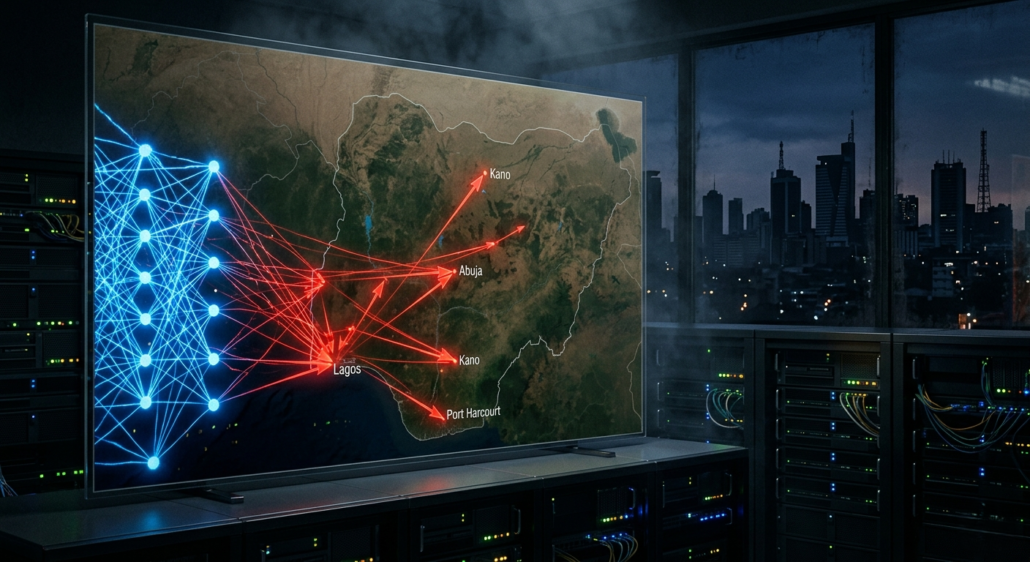 Glowing neural network transforming into cyberattack vectors targeting a map of Nigeria, dark server room background